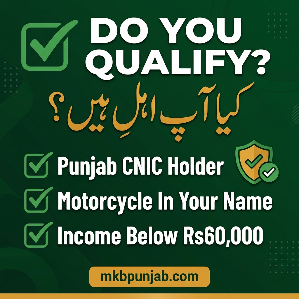 The mkb.punjab.gov.pk portal’s specific scope covers motorcycles. If you own a small car, check the latest updates on the official portal or call helpline 1000 to confirm whether your vehicle type qualifies.